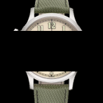 Strap: Composite material, fabric pattern, khaki green. White gold clevis prong buckle.