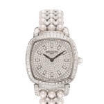 Dial : Paved with diamonds, blackened white gold applied trapeze-style hour markers set with diamonds. 18K gold dial plate. Blackened white gold leaf-shaped hands.