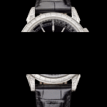 Strap: Alligator leather with square scales, hand-stitched, shiny black. Platinum fold-over clasp set with diamonds.