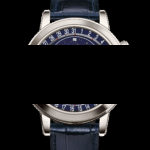 Strap: Alligator leather with square scales, hand-stitched, shiny navy blue. Platinum fold-over clasp.